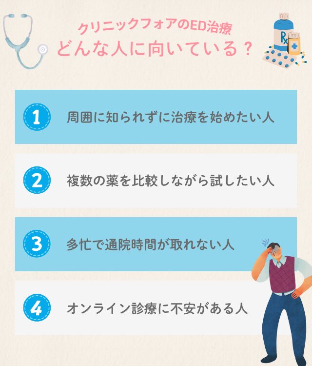 クリニックフォアのED治療は、オンラインならではの利便性やサポート体制の充実から、以下のようなニーズを持つ方に適している。