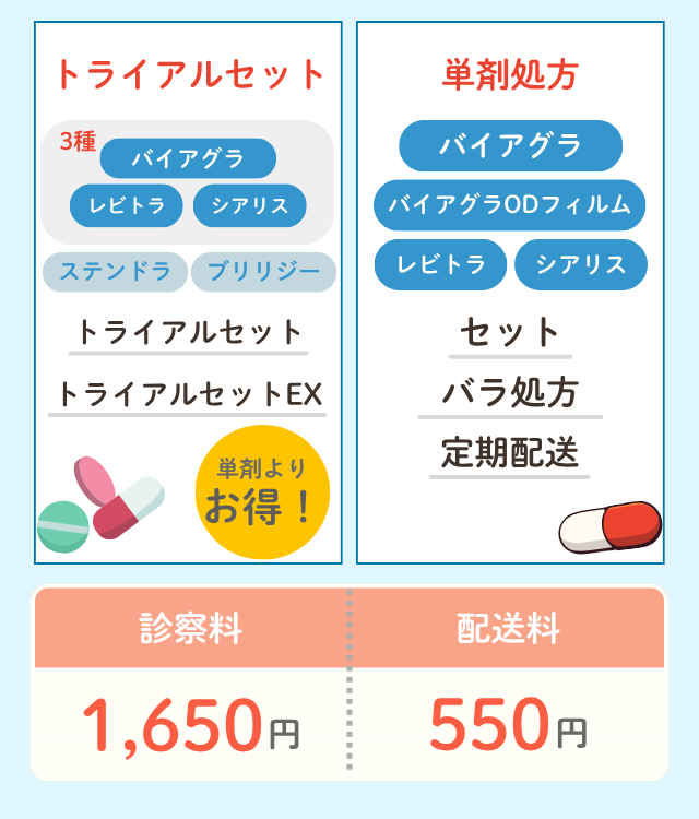 診察料は1,650円(税込)、配送料は550円(税込)で、薬剤費は1錠あたり数百円から1,000円超の幅がある。