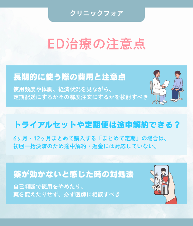 クリニックフォアのED治療はオンラインで手軽に始められる一方、継続治療を前提としたサービスでもあるため、事前に確認すべき点がいくつか存在する。